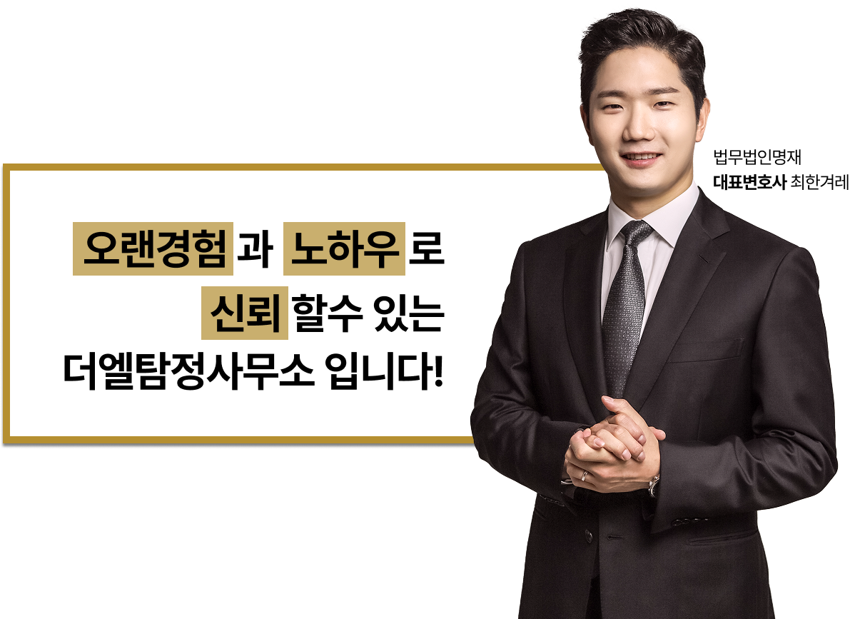 01. 저희 더엘탐정사무소는 사업자등록후 정식합법업체입니다 02. 계약이후비용 이외 어떤 추가비용은 절대요구하지 않습니다 03. 정식탐정 PIA정회원이며 자격증 소지하고있습니다 04. 합리적인 의뢰비용으로 고객만족100%